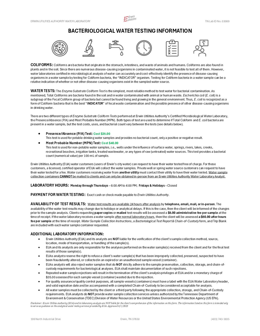 If you plan to use our water testing services, please email lab@e-u.cc to receive your customized Bacteriological Test Report & Chain-of-Custody form. You can expect to recieve your water test results via email.